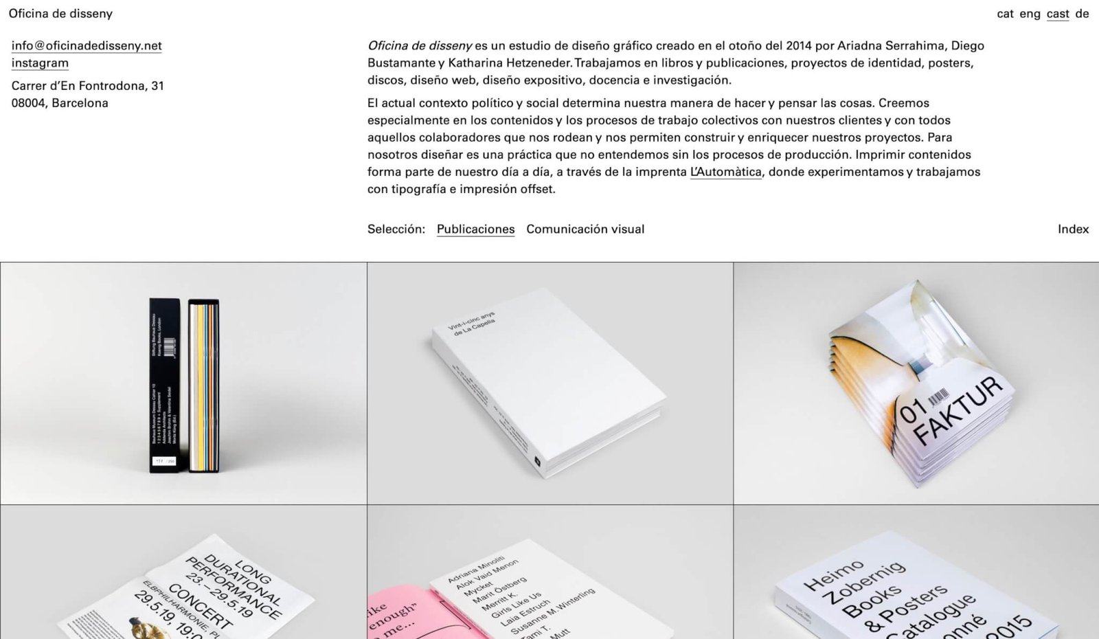 Oficina de disseny és un estudi de disseny gràfic creat a la tardor del 2014 per l’Ariadna Serrahima, el Diego Bustamante i la Katharina Hetzeneder. Treballem en llibres i publicacions, projectes d’identitat, posters, discs, disseny web, disseny expositiu, docència i recerca.